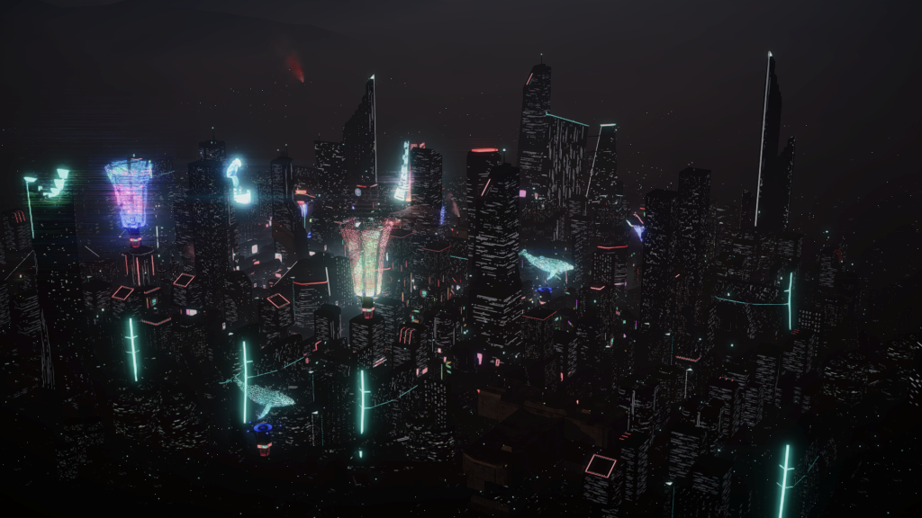 下記画像は筆者のプレイ中動画だが、様々な形の建物を好きなように並べていく。するといい具合に自動でネオンや明かりが追加されて、有機的に繋がっているような都市が形作られる。規模が大きくなるとご褒美に設置できるオブジェが開放されていくという流れ(下記画像のクジラのネオンなど)。